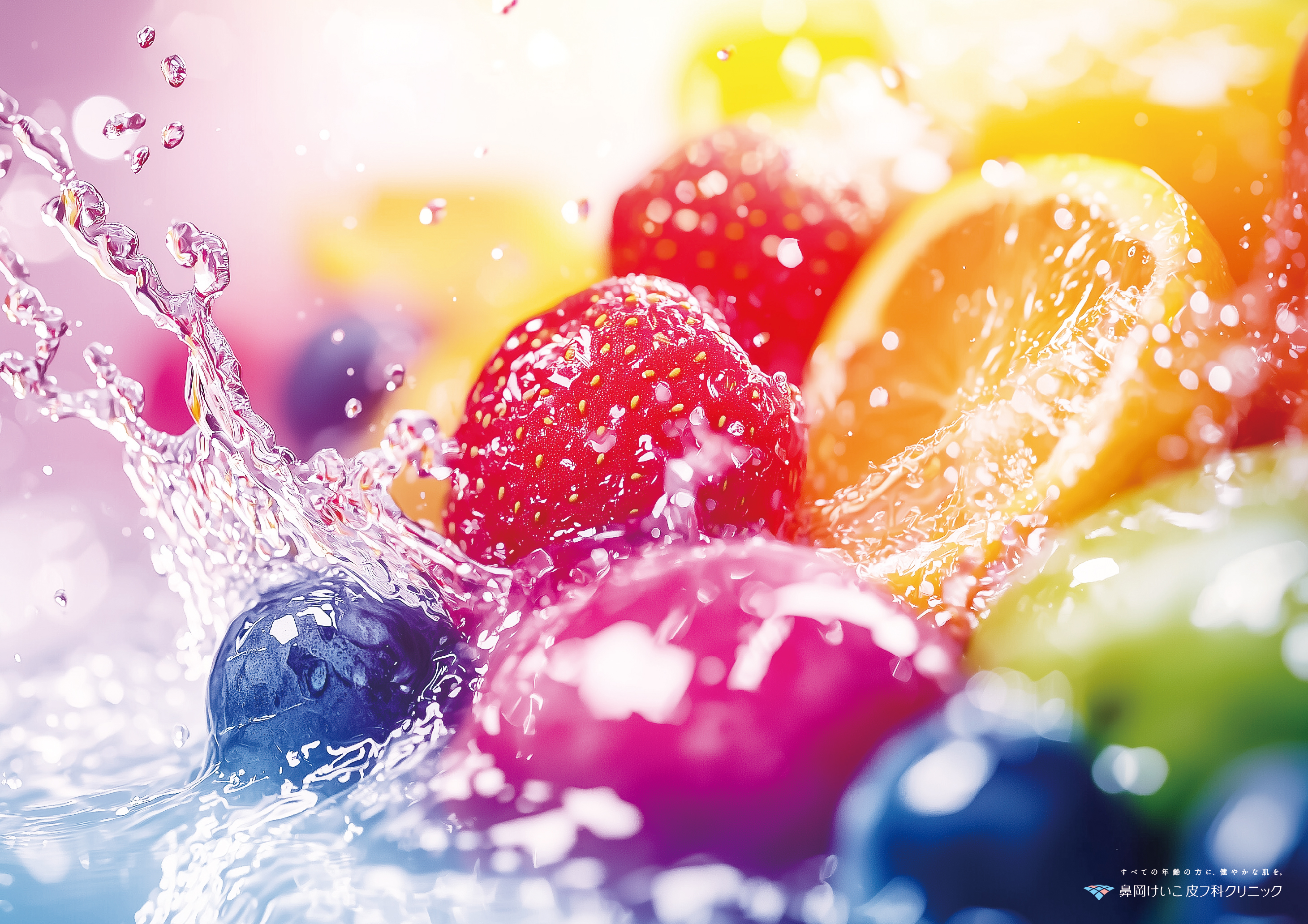 ダメージや時間の経過、ストレスなどが原因で起こる肌トラブルを果物で表現しました。
